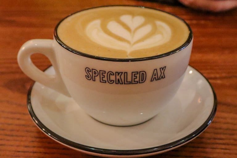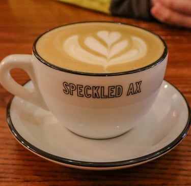 I tried to go to Tandem; however, the line was out the door. It's my understanding now that this is fairly common, but I was hoping to find a nice, quiet place to sit and relax, so I didn't end up waiting in line (but definitely hope to get back there soon!) and instead headed over to the Speckled Ax at their Congress Street location. Speckled Ax caught my eye because they roast their coffee using wood for roasting, which is highly unique, so I had to check out the coffee and see if it was worth the hype. They also specialize in single-origin coffees with super unique packaging, and they offer monthly subscriptions for their beans as well.